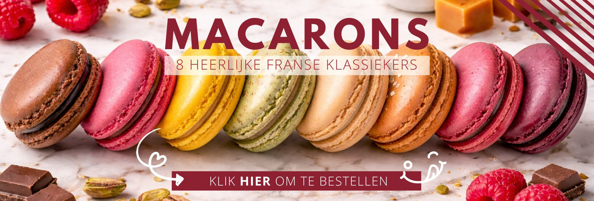 Amandel cake bodem met stukjes cranberry erin, witte chocolade mousse met dubbel laag rood fruit. Het verschillende rode fruit koken wij tot een mooie gladde saus.