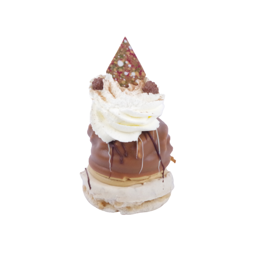 Schuimbodem van mokka een toren gemaakt, gevuld met caramel, door de chocolade gehaald.